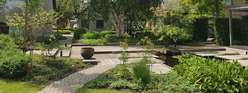 Het lijkt dat je eerst naar de grote lijnen kijkt; waar gaan we zitten, waar komt het gras, wat zijn de kijklijnen. Beter is om eerst nog in vorm en ruimte te denken. Niet makkelijk omdat je geprogrammeerd bent in functies. Terras, pad naar de voordeur, parkeerplaatsen, plek om te voetballen en ‘ze willen graag een vijver’. Door het vlak met z’n bestaande waarde (bomen, beplanting, belending) en ruimte in eerste instantie een vrije tekening te maken waar je ook driedimensionaal vertaald, ontstaan er ideeën en toepassingen die anders verborgen blijven. In een goed ontworpen tuin zijn er steeds verrassingen die niet allemaal direct opvallen.