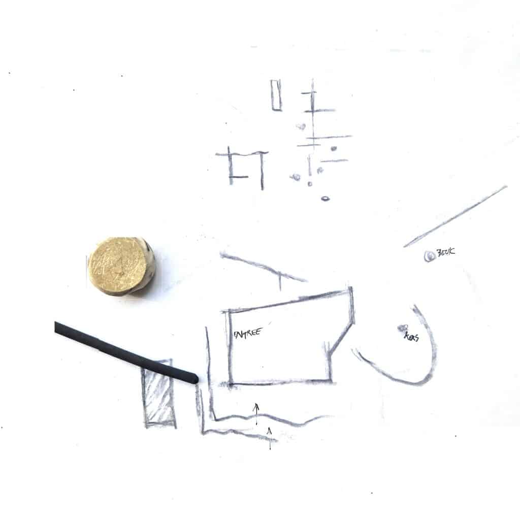 De dagen erna komt de situatie en de gesprekken meerdere malen terug. Er vormt zich al een beeld welke kant het op zou kunnen gaan. Is er al in harde (stenen, staal) en halfharde (grind, hout) materialen te denken. Wat past er als huid van deze materialen. Plekken van bomen, waar mogen deze groter worden of is kleiner beter. Opmerken van schaduw en het straks maken van schaduw voor bladplanten, waar wordt het heet, waar is hoog licht, waar is het vochtig en waar droog. De driedimensionale maten inschatten. Zijn er al zichtlijnen.