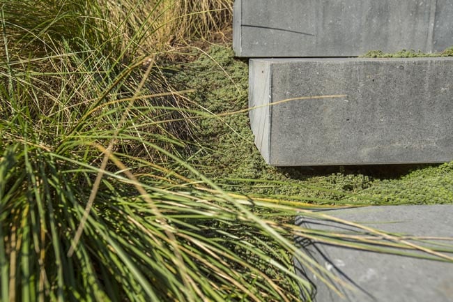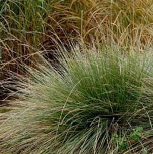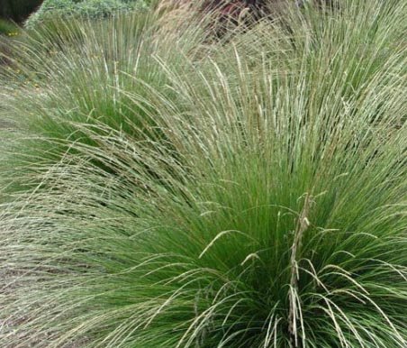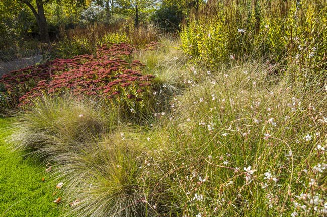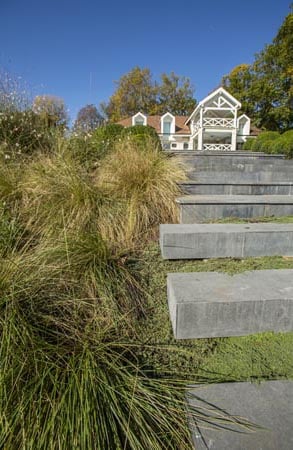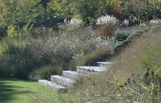 There are several types of grass that can be planted in powdery dry earth on a southern slope and the Festuca mairei is one of them. Because the bloom is not pronounced, its design quality mainly lies in its dense, bushy form with its robust, powerful appearance, therefore going well together with hard elements and cropped shapes like in the photo example. That bushy, sturdy form is the basis for thin, transparent neighbours and solitary plants. In my view, this Festuca is completely different to all other species of the grass family, such as Panicum, Calamagrostis, Molinia, Pennisetum, etc., and is therefore fascinating and challenging to use in different situations.